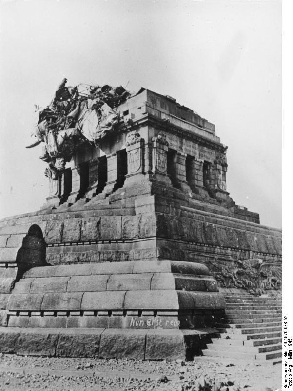 Das Deutsche Reich mit seinem Kaiser Wilhelm I. im März 1945. Die Gaudi des amerikanischen Kanoniers muss riesig gewesen sein: "Wetten wir, dass ich den da runterputze? - Top, die Wette galt. Der einzige Schuss im 2. Weltkrieg, der nicht weh getan hat. Hätte man das Denkmal am Deutschen Eck nicht so lassen können? Warum? Ganz einfach: "Nach dem Tod Wilhelms I. im Jahre 1888 entstand in verwirrten Köpfen der Koblenzer Aristokratie die Idee, ihm für die 3 Kriege von 1864, 1866 und 1871 ein Denkmal zu errichten. Den originalen Rest des deutschen Schinders findet man Quelle und Autorenrechte: Bundesarchiv, Bild 146-1970-088-52 / CC-BY-SA 3.0, CC BY-SA 3.0 de / |