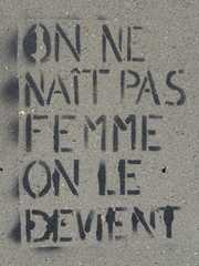 Schwarze Farbe auf Beton Man wird nicht als Frau geboren, man wird dazu. Berlin, Treptower Park, ca. 40x gesprüht. |