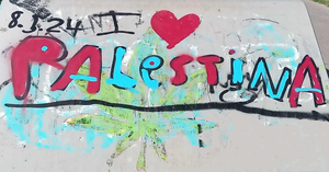 Für ein freies Palästina, ...! Der Standort des Denkmals ist der Redaktion bekannt, wird aber nicht publiziert. Der Ort ist öffentlich zugänglich. Auch die Künstler bleiben unbekannt. Denn in Deutschland werden Menschen, die "Ein freies Palästina, vom Fluss bis an die See" wollen, wegen "Volksverhetzung" von der Staatsanwaltschaft angeklagt. Ein klassischer Fall von Denk Mal ! |