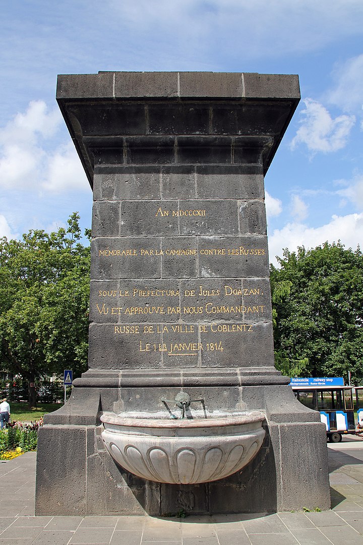 Russische Kultur ist derzeit nicht gefragt im NATO-Land Deutschland. Um so schöner ist Koblenz. AN MDCCCXII Die ersten 3 Zeilen sind vom französischen Prefekt in Koblenz, die letzten 3 Zeilen vom russischen Stadtkommandanten, der ihm folgte. Hintergrund: Napoleon Bonaparte führte 1812 einen Krieg gegen Russland. 1813 war er auf dem Rückweg, die russische Armee an den Fersen. Die Übersetzung: "Anno 1812 "Gesehen und genehmigt von uns, dem russischen Stadtkommandanten von Koblenz Quelle und Autorenrechte: Holger Weinandt - Eigenes Werk, CC BY-SA 3.0 de, https://commons.wikimedia.org/w/index.php?curid=15592324 |